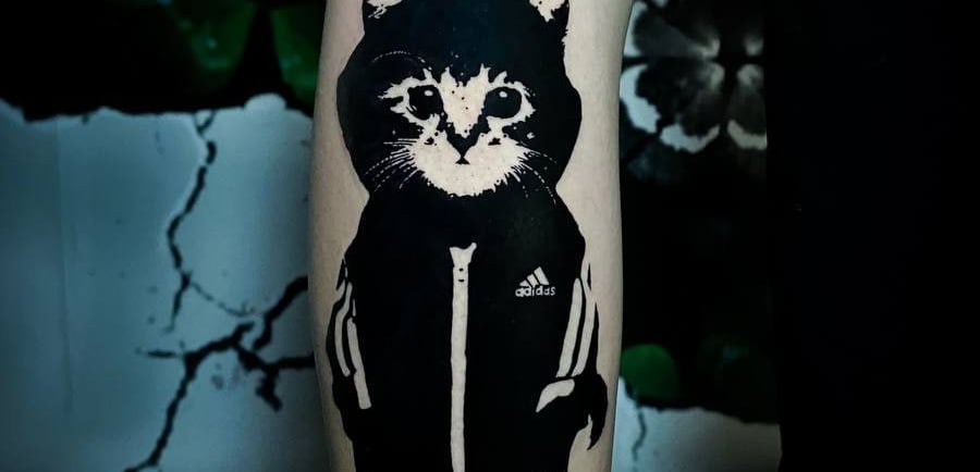 A street-style Adidas cat tattoo that combines bold blackwork, humor, and personality. Learn about the meaning, design style, placement ideas, and aftercare.